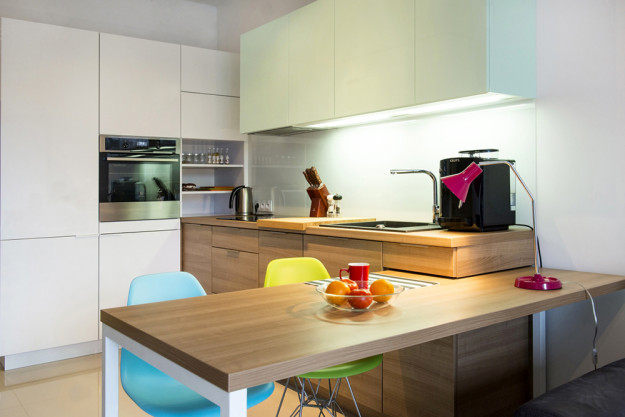 Jedna z naszych ostatnich realizacji mebli, niewielkie mieszkanie dla studentki ASP, więc niezbędny duży mobilny stół do pracy i spożywania posiłków. Projekt Joanna Pera – www.joannapera.eu