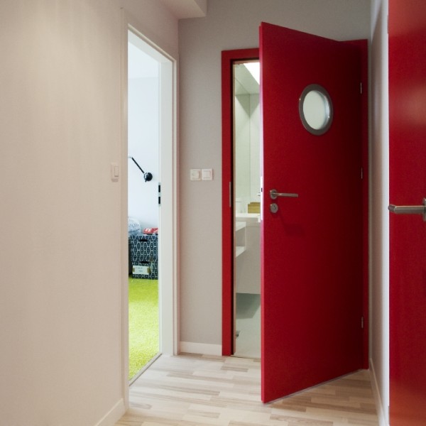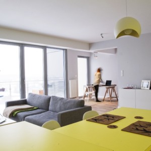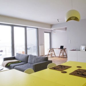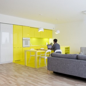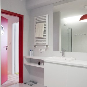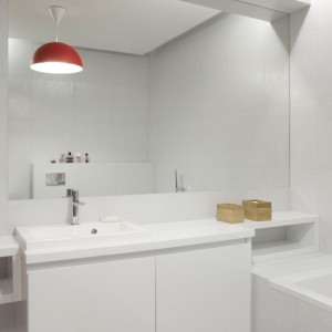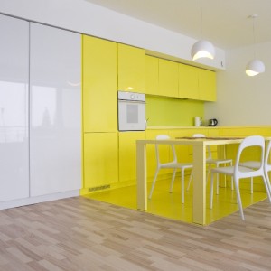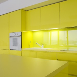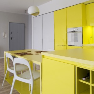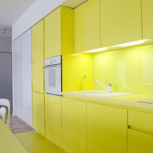 Meble kuchenne oraz łazienkowe wykonane z MDF-u lakierowanego w połysku. Wszystkie szafki otwierane bez użycia tradycyjnych uchwytów.