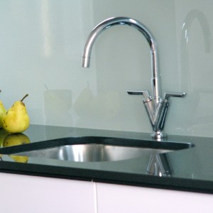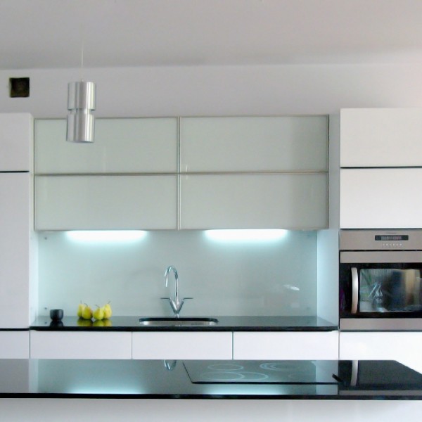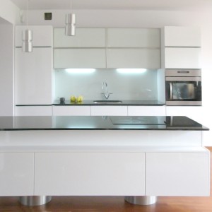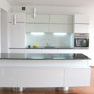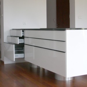 Wykonana z MDF – u lakierowanego w połysku. Wyspa spoczywa na dwóch stalowych walcach.Blat wykonany z czarnego granitu. Projekt – Katarzyna Arsenowicz