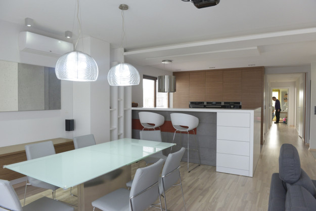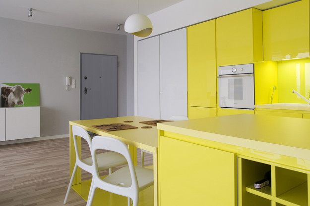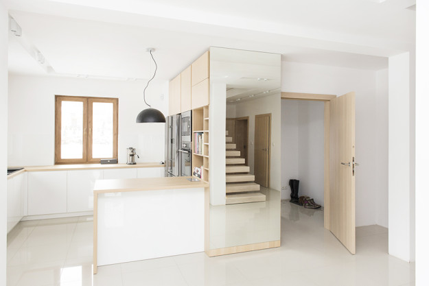 Meble kuchenne oraz łazienkowe wykonane z MDF-u lakierowanego w połysku. Wszystkie szafki otwierane bez użycia tradycyjnych uchwytów. Projekt Joanna Pera – www.joannapera.eu