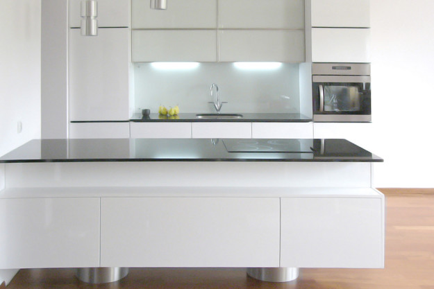 Wykonana z MDF – u lakierowanego w połysku. Wyspa spoczywa na dwóch stalowych walcach.Blat wykonany z czarnego granitu. Projekt – Katarzyna Arsenowicz