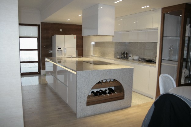 Kuchnia wykonana z MDF lakierowany w połysku z dodatkami drewna dębowego (winnik oraz obudowa słupków wysokich). Blaty i panele naścienne granitowe.