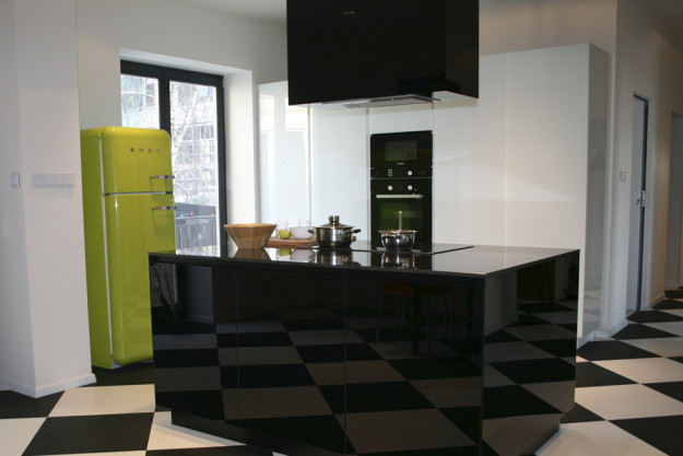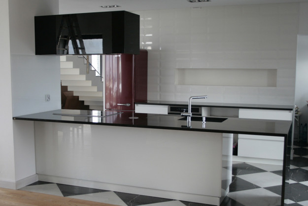 Widoczne elementy kuchni wykonane z czarnego i białego szkła (lakobel) z witryną z drewna egzotycznego Frake. Blat wykonany z czarnego granitu. Projekt mebli Piotr Wysogląd